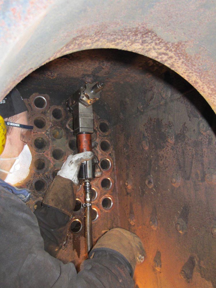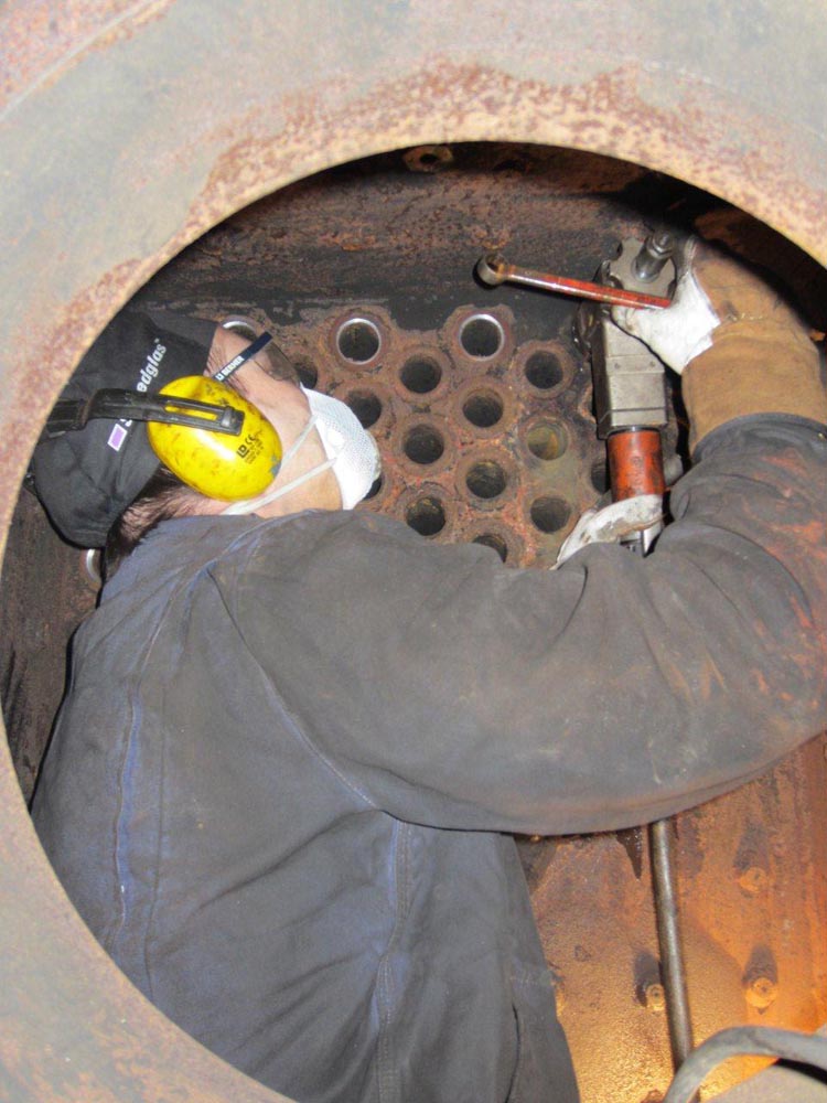 Arbetet med Polskalokets panna fortsätter, här skär man bort kragarna på tuberna. |