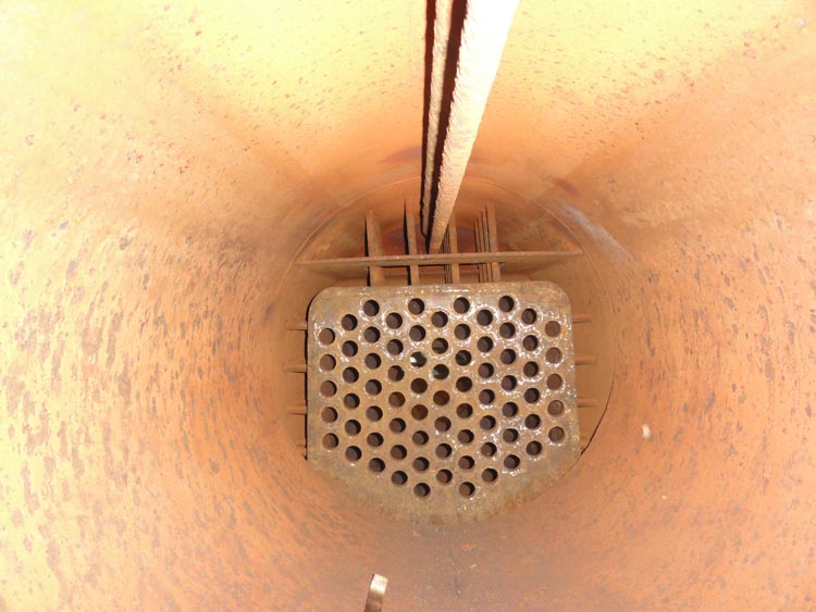 Genom tubgaveln kan man skymta eldstadsluckan. I rundpannan där vi befinner oss ser man två runda rör passera kameran.