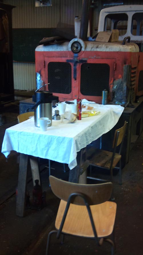 Det dukades ett bord i verkstaden så inspektören kunde få sig en kopp. |